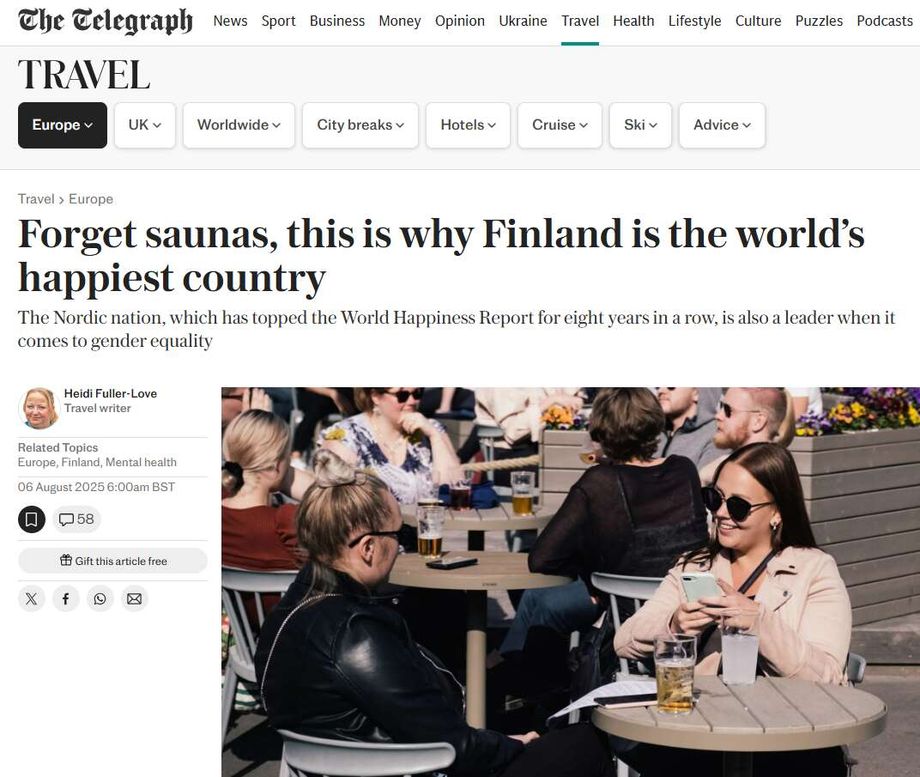 Toimittaja tuo artikkelissa esiin, että Suomi oli ensimmäistä kertaa maailman onnellisin maa vuonna 2018 – juuri ennen kuin Sanna Marinin naisvaltainen hallitus nousi valtaan.